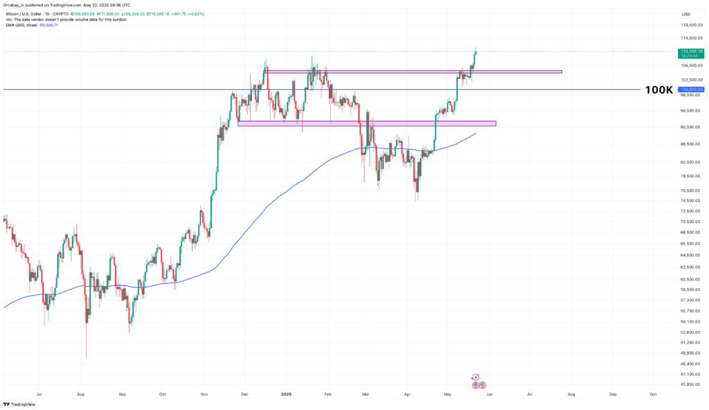 Our scenario of a strong breakout above $105K and new all-time highs played out exactly as expected. Bitcoin is now in price discovery mode, having breached resistance with momentum. On any pullback, we may see a retest of the previous range high around $105K.