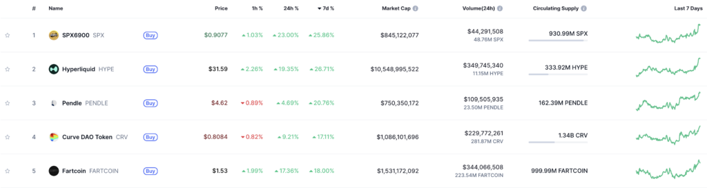 This week’s top gainer is SPX6900, up 25.86%, as the memecoin inspired by Murad’s iconic chart picks up serious steam. Hyperliquid (HYPE) continues its upward momentum with a 26.71% weekly gain, driven by rising traction of its native DEX. Pendle also had a strong showing, rising 20.76%, while Curve DAO Token (CRV) followed with 17.11%. Rounding out the top 5 is Fartcoin, up 18.00%, proving its staying power in current market conditions.