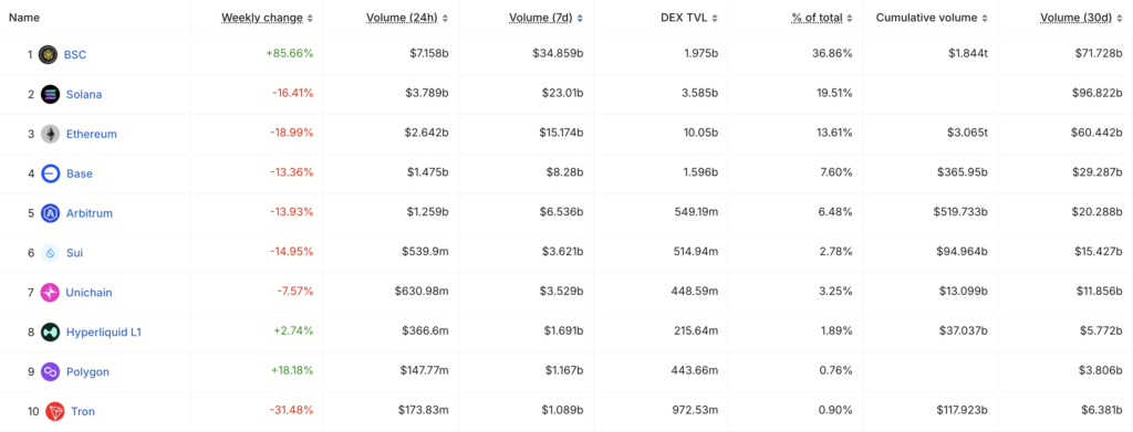 In weekly DEX volume by chain, only three chains showed positive growth:BSC surged with an impressive +85.66%, Polygon followed at +18.18%, and Hyperliquid managed a modest +2.74%. Meanwhile, major players like Ethereum (-18.99%), Solana (-16.41%), and Arbitrum (-13.93%) saw significant declines, suggesting a selective shift in on-chain trading activity.
