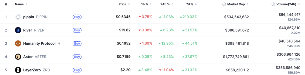 This week’s best performers saw selective strength despite broader market uncertainty. pippin ($PIPPIN) led the pack with outsized gains, followed by River ($RIVER) and Humanity Protocol ($H)posting strong weekly performances.