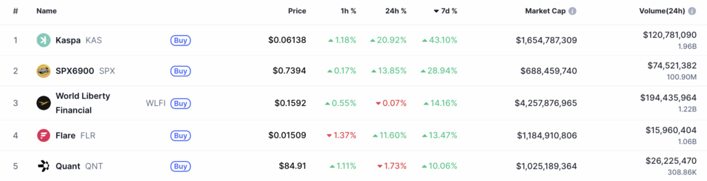 A mixed bag after last week’s flush. Kaspa ($KAS) and SPX6900 ($SPX) bounced strongly, while World Liberty Financial ($WLFI) and Flare ($FLR) saw steady but modest gains. Quant ($QNT) also edged higher, showing resilience despite broader market volatility.