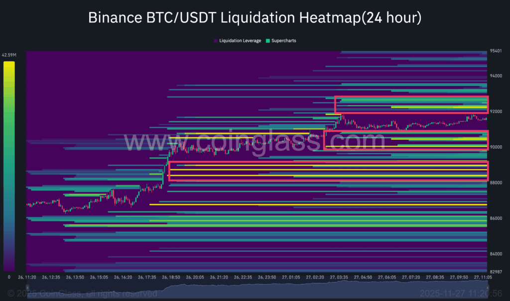 Now, $92K has flipped into weekly resistance, and the key is to watch how price reacts at this level. There is some high-level liquidity sitting above $92K, but a significant cluster still remains in the $90K–$88K zone.
