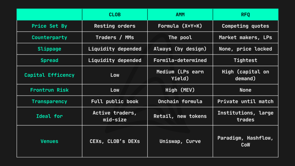 CLOB vs AMM vs RFQ: Side-by-Side Comparison