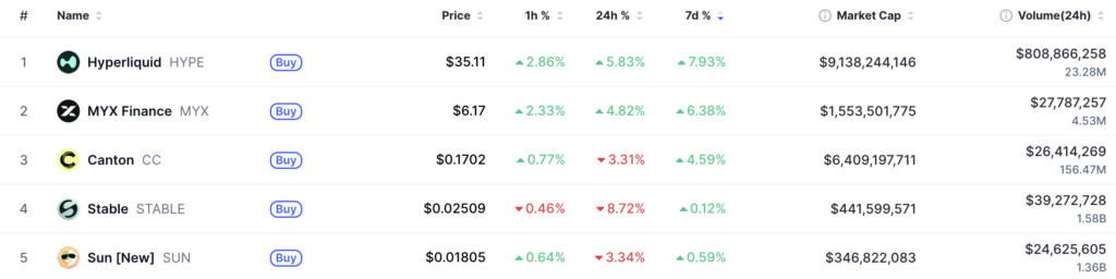 Outside of $HYPE, moves were muted, with MYX Finance ($MYX), Canton ($CC), Stable ($STABLE), and Sun ($SUN) all posting only small, incremental gains.