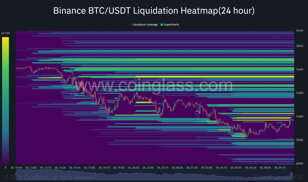 On-chain cost basis data shows initial accumulation in the $70K–$80K range, while a dense supply cluster between $66.9K and $70.6K stands out as a high-conviction area where near-term sell pressure could be absorbed.