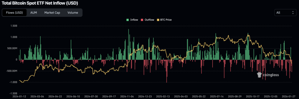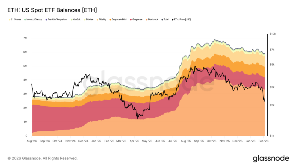 Institutional conviction has largely evaporated, creating a “demand vacuum” where sell-side pressure is not being met by sustained absorption. Flows into ETFs and Digital Asset Trusts have flipped negative, a sharp reversal from the prior expansion phase. This retrenchment has left major corporate holders deeply underwater; MicroStrategy’s Bitcoin position has seen unrealized losses rise above $3.5 billion, while Bitmine is reportedly sitting on over $7 billion in losses on its Ethereum holdings. Despite this asset price weakness, stablecoin infrastructure continues to expand; Tether reported a record market cap of $187.3B in Q4 2025, signaling that while crypto asset demand is soft, the demand for dollar-denominated on-chain rails remains robust.