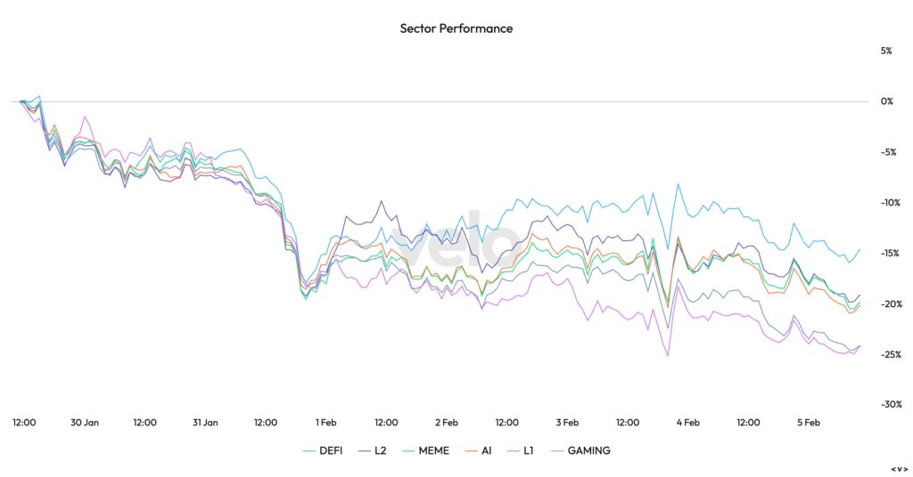 It was a highly volatile week, with crypto markets deep in the red and more than $600B wiped from total market cap. Bitcoin fell to around $70K, down roughly 16% week over week, while ETH dropped to $2K. The main outlier was Hyperliquid ($HYPE), trading near $34 and standing out as one of the few pockets of relative strength. Precious metals were also hit by volatility, with gold slipping below $5,000/oz and silver collapsing over 30%, falling from $115/oz to $80/oz.