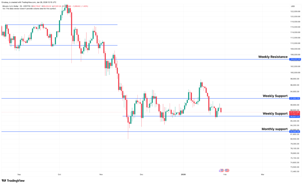 Wednesday’s FOMC meeting delivered no change to interest rates, which remain in the 3.50–3.75% range, with Fed Chair Jerome Powell striking an optimistic tone, noting the U.S. economy is holding up well despite geopolitical tensions and tariffs. Equities pushed higher, with the S&P 500 hitting 7,000 for the first time, while gold and silver continue to print fresh all-time highs, with gold above $5,500/oz and silver above $117/oz. In contrast, Bitcoin remains range-bound between $87K–$90K, and ETH continues to chop around $3,000.