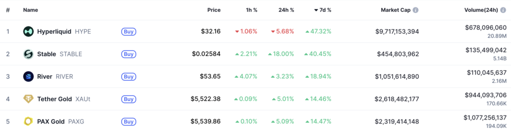 Rounding out the list are Tether Gold ($XAUT) and PAX Gold ($PAXG), both benefiting from the continued gold rally as investors lean into gold-pegged assets amid macro uncertainty.