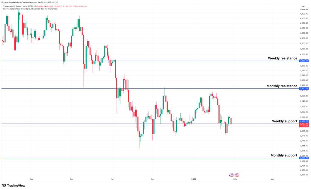 $ETH is currently testing its weekly support. From a risk reward perspective, positioning here makes sense with a stop below the previous low. For now, the range between $3,400 and $2,900 remains intact and continues to be respected.