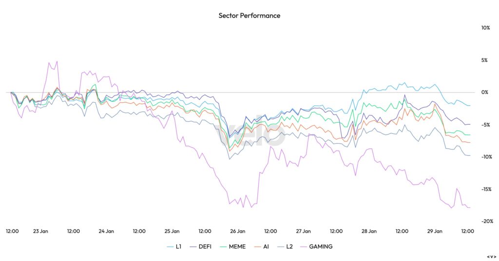 According to GMCI, the GMCI 30, which tracks the top 30 cryptocurrencies, is down 2.63% over the past week. The GMCI Mid Cap is down 6.93%, while GMCI Small Cap indices posted a loss of 6.52%. The rest of the sectors: