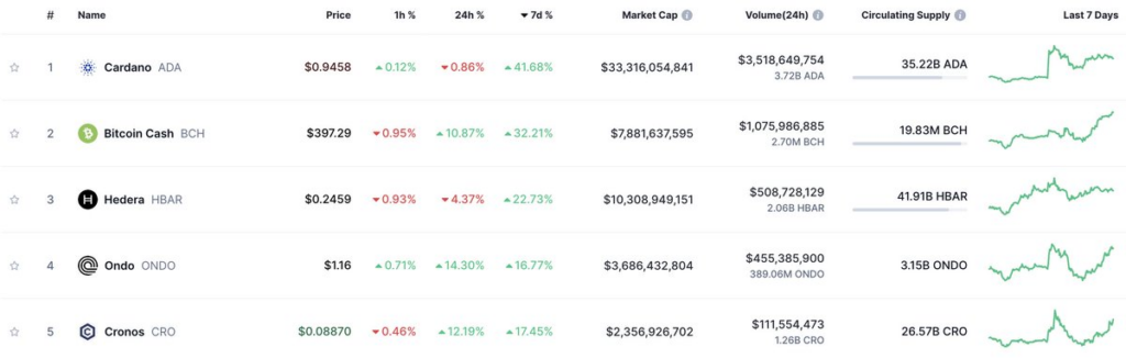 This week’s top performer is Cardano (ADA), surging 42.40%, unsurprisingly fueled by Trump naming ADA as part of the U.S. Crypto Strategic Reserve—though the inclusion itself came as a major surprise.