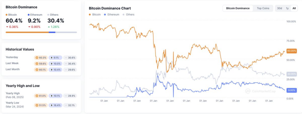 - The Fear & Greed Index sits at 25 (Extreme Fear), while Bitcoin dominance remains high at 60.4%