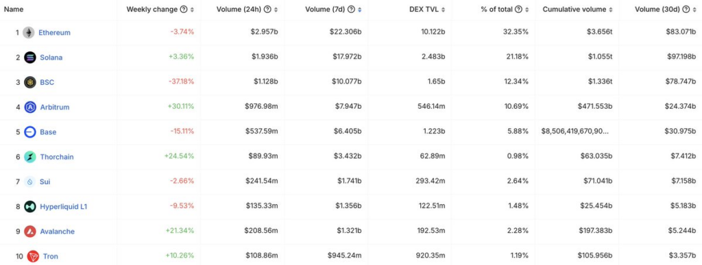 Meanwhile, Solana remained in second place, up 3.36%, holding steady after weeks of heavy sell-offs. BSC (Binance Smart Chain) struggled, posting a -37.18% decline, while Base (-15.11%) and Hyperliquid (-9.53%) also saw notable drops.