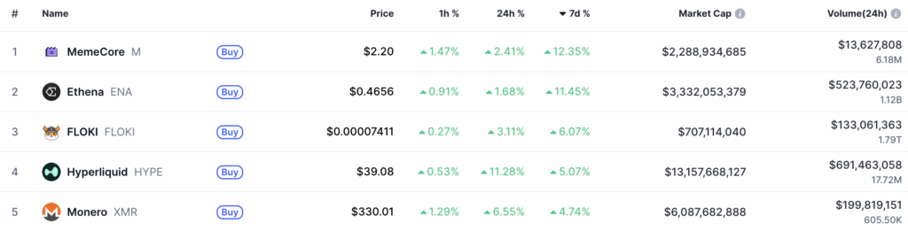 Ethena (ENA) gained +11.5%, driven by news that the project is developing two new products to strengthen its USDe and USDtb stablecoin ecosystem, with launches expected within the next three months.